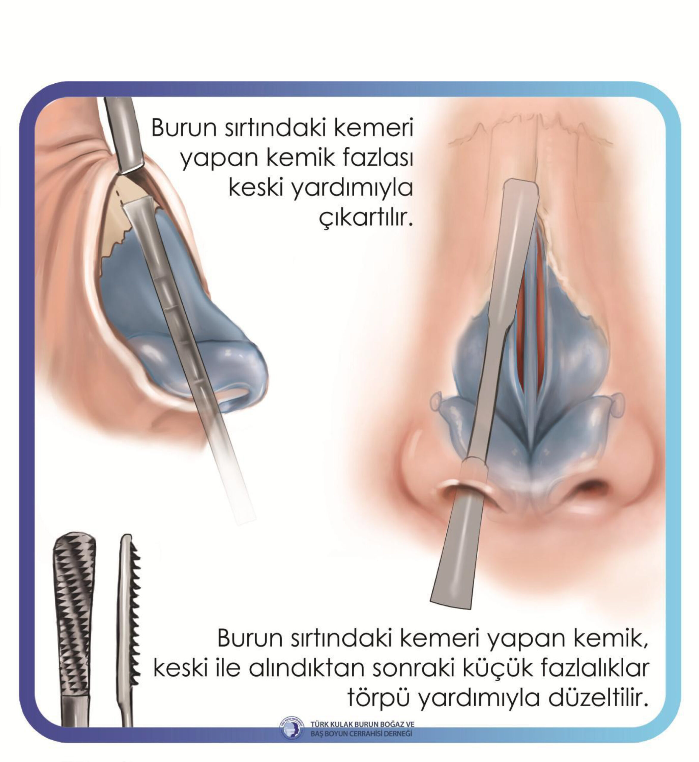 Burun sırtındaki kemeri yapan kemik fazlası keski yardımıyla çıkartılır. Burun sırtındaki kemeri yapan kemik, keski ile alındıktan sonraki küçük fazlalıklar törpü yardımıyla düzeltilir.