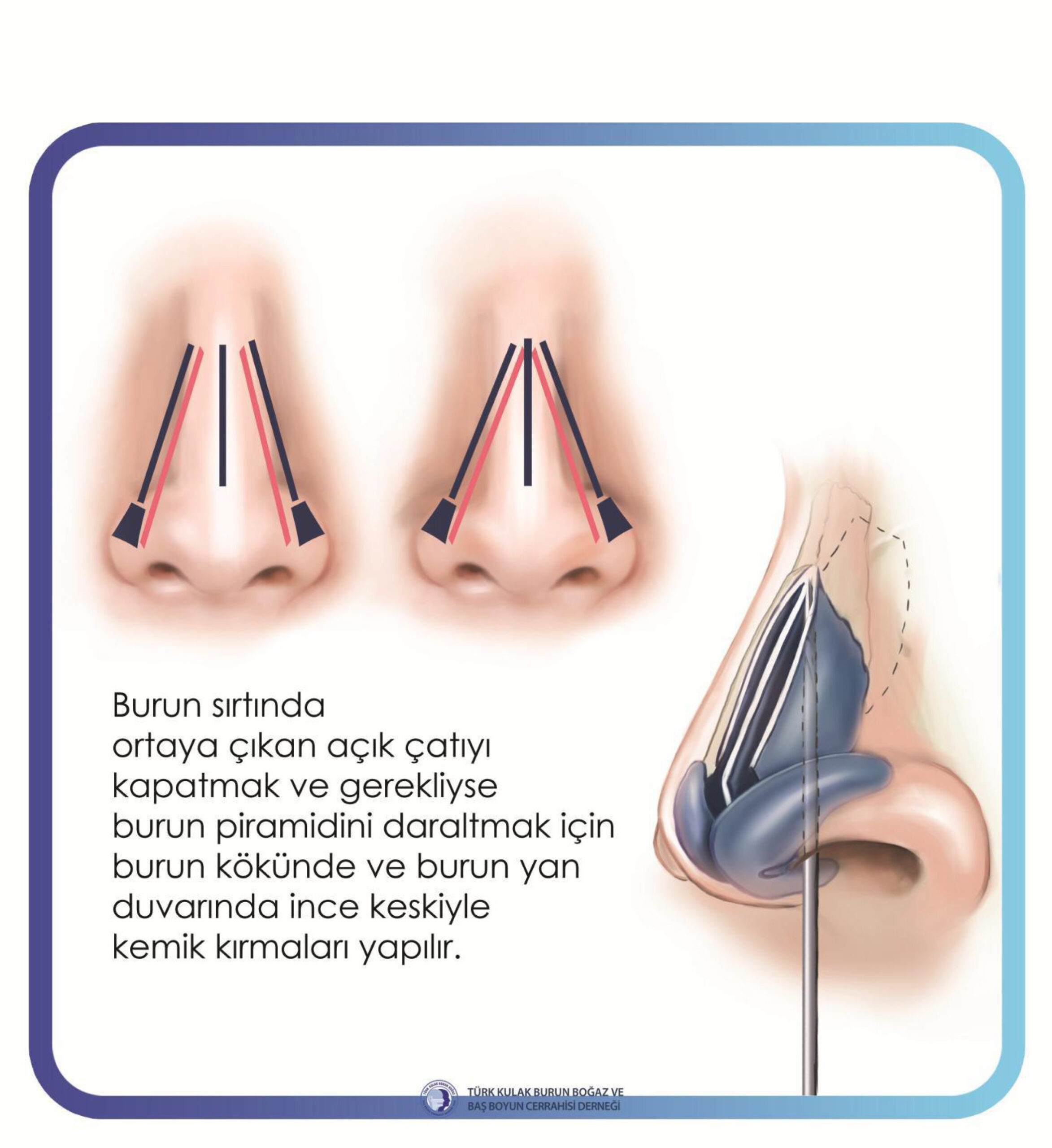 Burun sırtında ortaya çıkan açık çatıyı kapatmak ve gerekliyse burun piramidini daraltmak için burun köküne ve burun yan duvarında ince keskiyle kemik kırmaları yapılır.