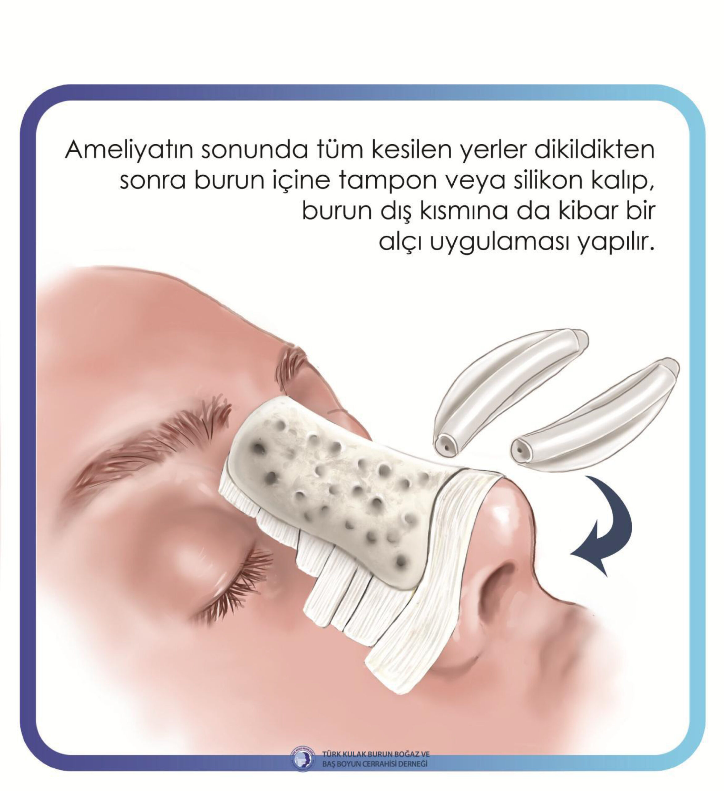 Ameliyatın sonunda tüm kesilen yerler dikildikten sonra burun içine tampon veya silikon kalıp, burun dış kısmına da kibar bir alçı uygulaması yapılır.